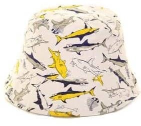 Bush hoed met haaibedrukking, voor jongensBeschikbaar in kleuren: wit, beige, turquoiseMaten: 53cm, 55 cmMateriaal: Katoen