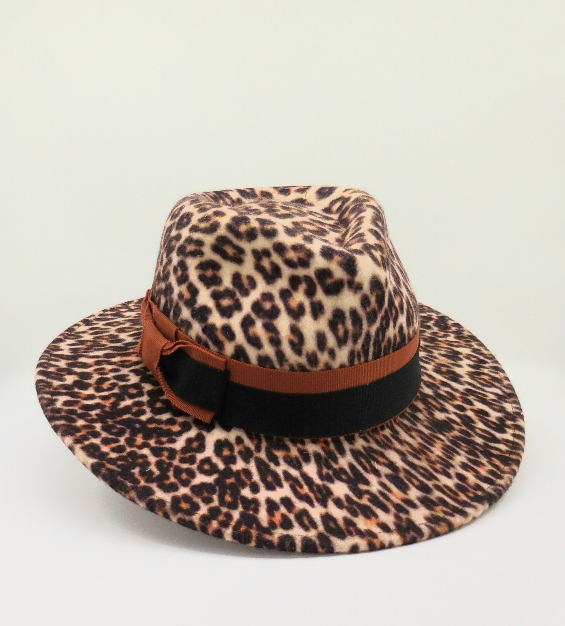 Fedodora met wildkat print. Gemaakt van wolvilt. Afgewerkt met zwart en roestbruin band en strik