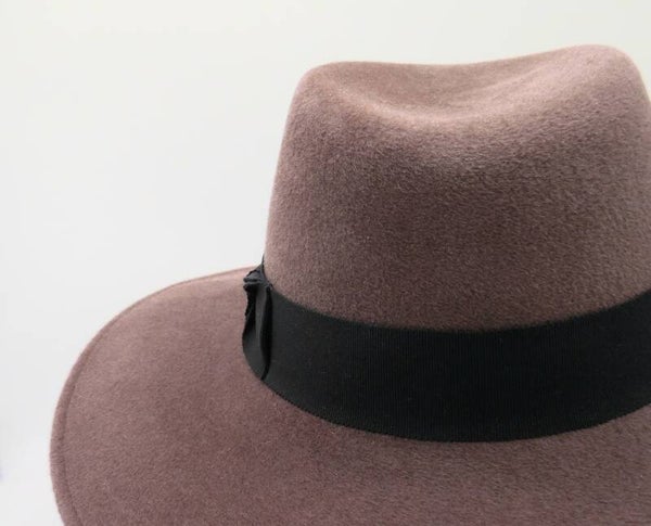 Hoed met brede rand mauve/grijs-bruin. Afgewerkt met zwart riblint. Gemaakt van velour vilt