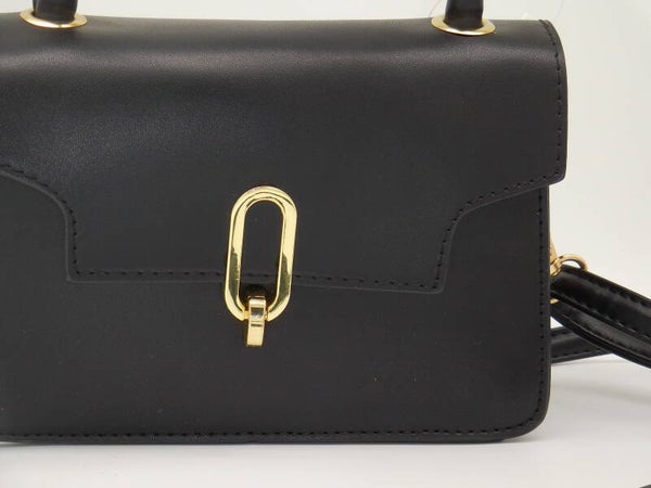Kleine handtas van zwart leer. Met draagriem en leuke decoratieve sluiting in het goud